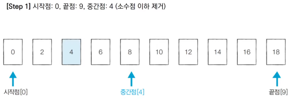 - 찾고자 하는 원소 4는 중간값[4]인 8보다 왼쪽에 존재한다.