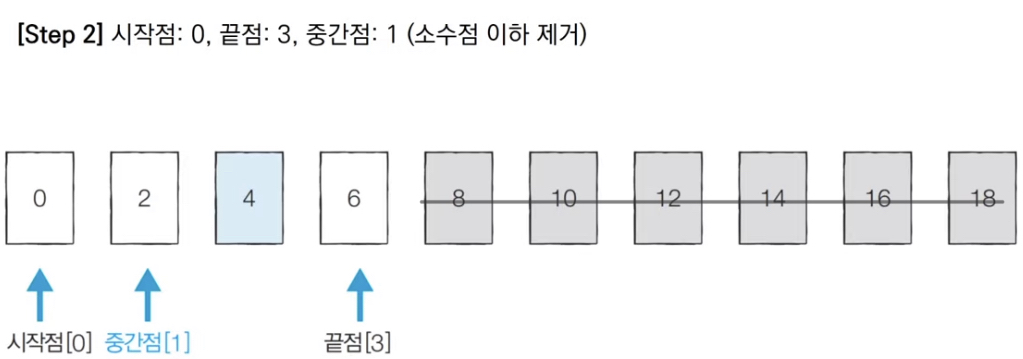 중간점 : (시작점+끝점) // 2 인덱스 (소숫점 이하 버림)