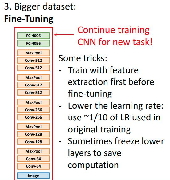 : 데이터 셋이 작고, 모델의 파라미터가 많다면 오버피팅 되기 쉽다 = 많은 계층 건들지 않기