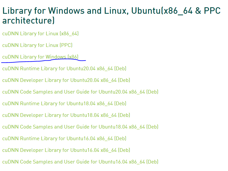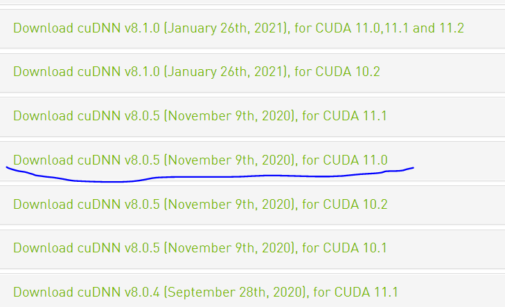 cuDNN=8.0 CUDA=11.0 에 알맞는 cuDNN v8.0.5 for CUDA 11.0을 다운로드 하였다.