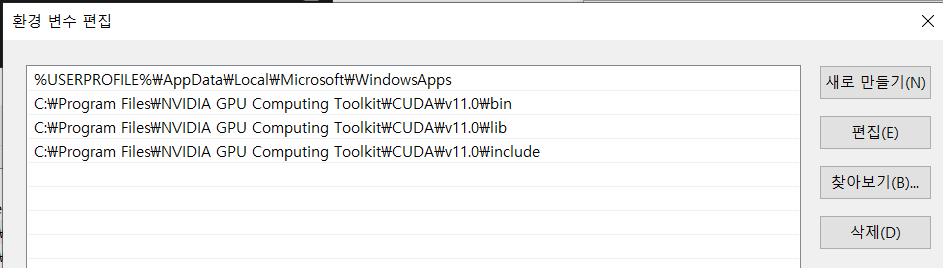 [편집]에 오른쪽 그림과 같이 3가지를 [새로만들기]를 통해 추가한다. 각 버전에 맞게 11.0 부분만 변경해주면 된다.