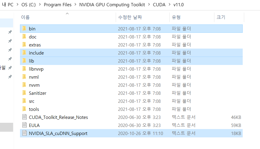 압축 풀어준 cuda 폴더 -> C:\Program Files\NVIDIA GPU Computing Toolkit\CUDA\v11.0 폴더