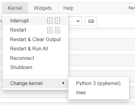 주피터 노트북에서 실행 도중 가상환경 커널을 변경해주고 싶다면, 목록에서 아래의 사진과 같이 변경해주면 된다.