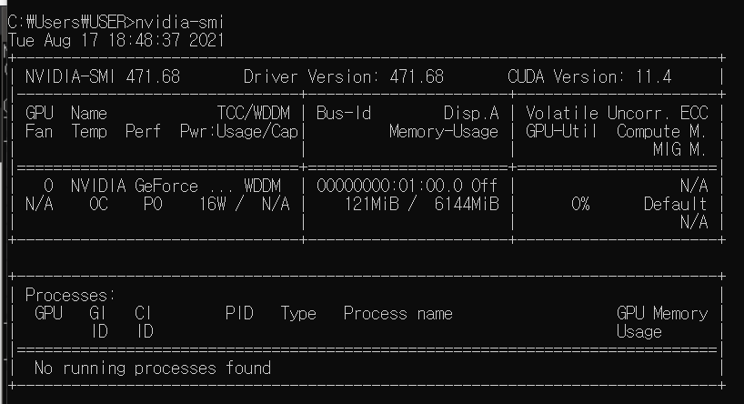 cmd 창에서 nvidia-smi 명령을 실행 후, 아래와 같이 출력되면 nvidia 드라이버는 잘 설치된 것이다.