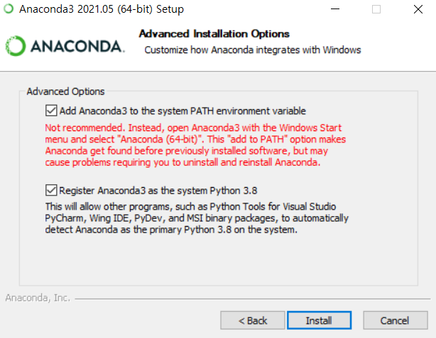 2) 첫번째 박스인 [Add Anaconda3 to the system PATH environment variable]을 추가로 클릭해주었다.