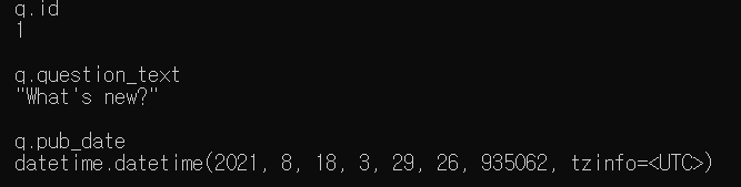 q = Question(question_text="What's new?",pub_date=timezone.now()) #새로운 질문 생성