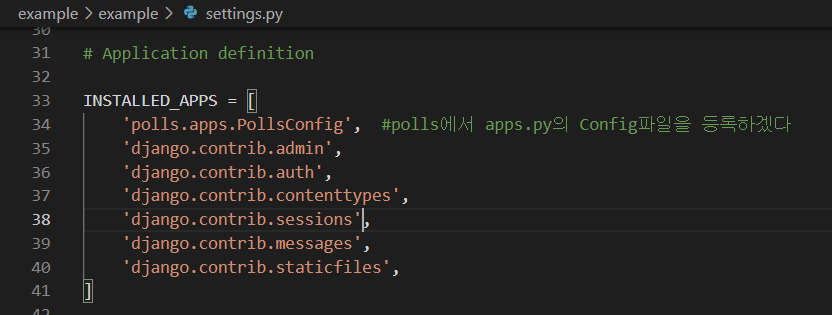 path('polls/', include('polls.url')), #include 함수를 통해 방금 만든 polls앱의 url.py를 연결한다.